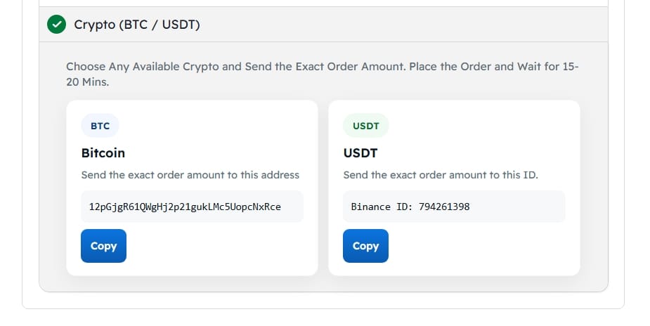 ✔ Accept BTC & USDT (ERC20 / TRC20 / BEP20 / Binance ID)